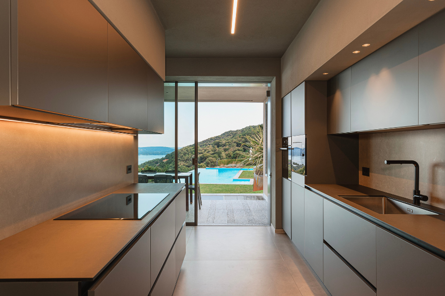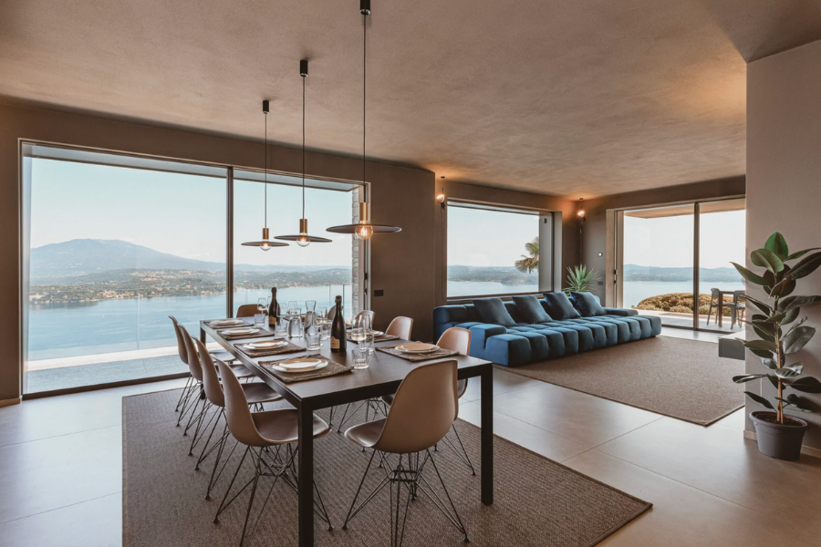 Il nostro lavoro di ristrutturazione e riqualificazione ha ridefinito gli spazi interni ed esterni, privilegiando design minimalista, materiali nobili e l’uso di ampie vetrate panoramiche che fondono l’ambiente domestico con il paesaggio. Un elemento distintivo del progetto è l’installazione della spettacolare piscina a sfioro, la cui acqua sembra prolungarsi senza soluzione di continuità nel lago sottostante, creando un’opera di eccellenza esecutiva e armonia ambientale.